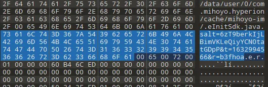 objection -g com.mihoyo.hyperion explore> memory dump all from_basedump 出来的内存用 010 editor 搜索下salt=,果然能找到。