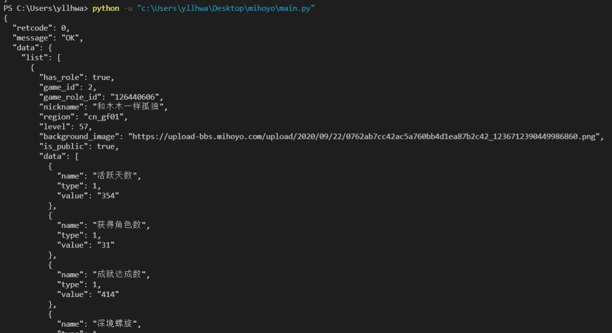 headers = { "DS": get_ds(), "cookie": "", # put your own cookie here "x-rpc-client_type": "2", "x-rpc-app_version": "2.13.1", "x-rpc-sys_version": "11", "x-rpc-channel": "xiaomi", "x-rpc-device_id": "", # put your own device_id here "x-rpc-device_name": "Xiaomi M2007J3SC", "x-rpc-device_model": "M2007J3SC", "Referer": "https://app.mihoyo.com", "Host": "bbs-api.mihoyo.com", "User-Agent": "okhttp/4.8.0"}res = requests.get(url=url, headers=headers)print(res.json())成功截图 (该用户系从社区随机选择):